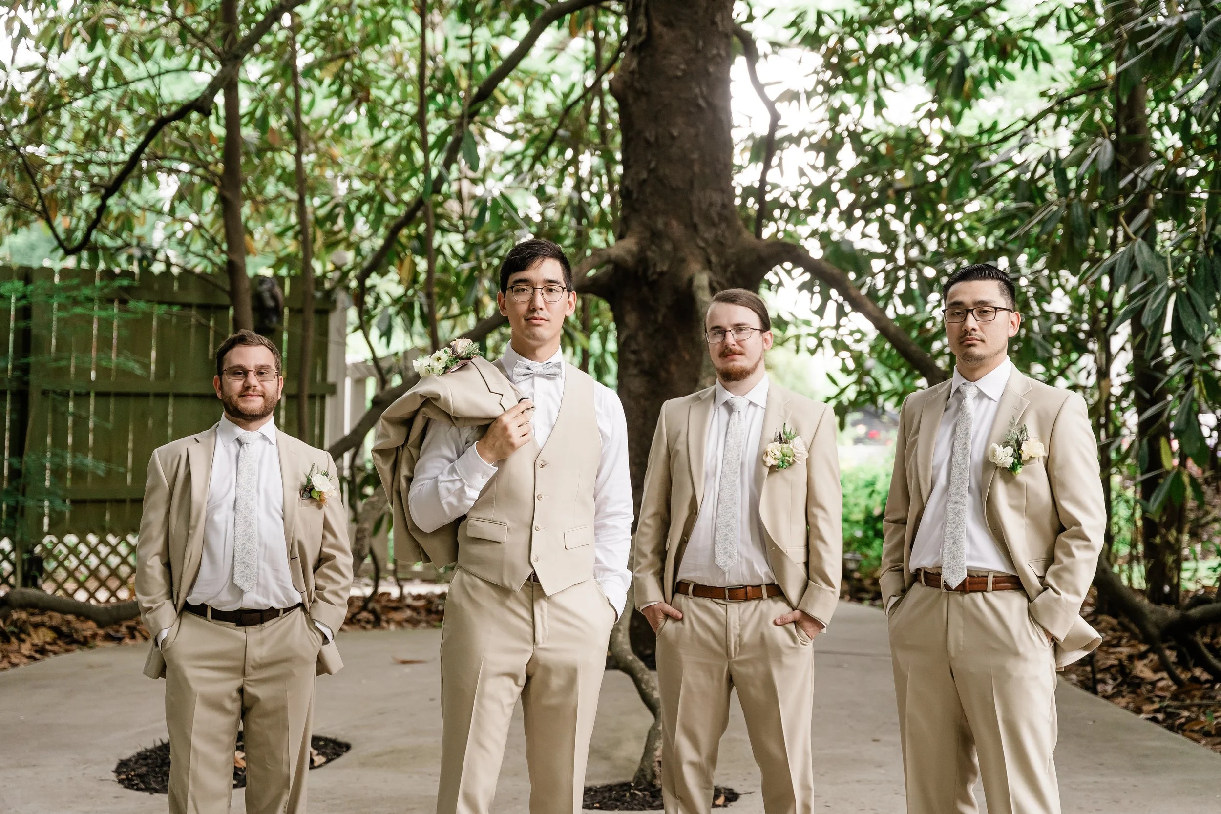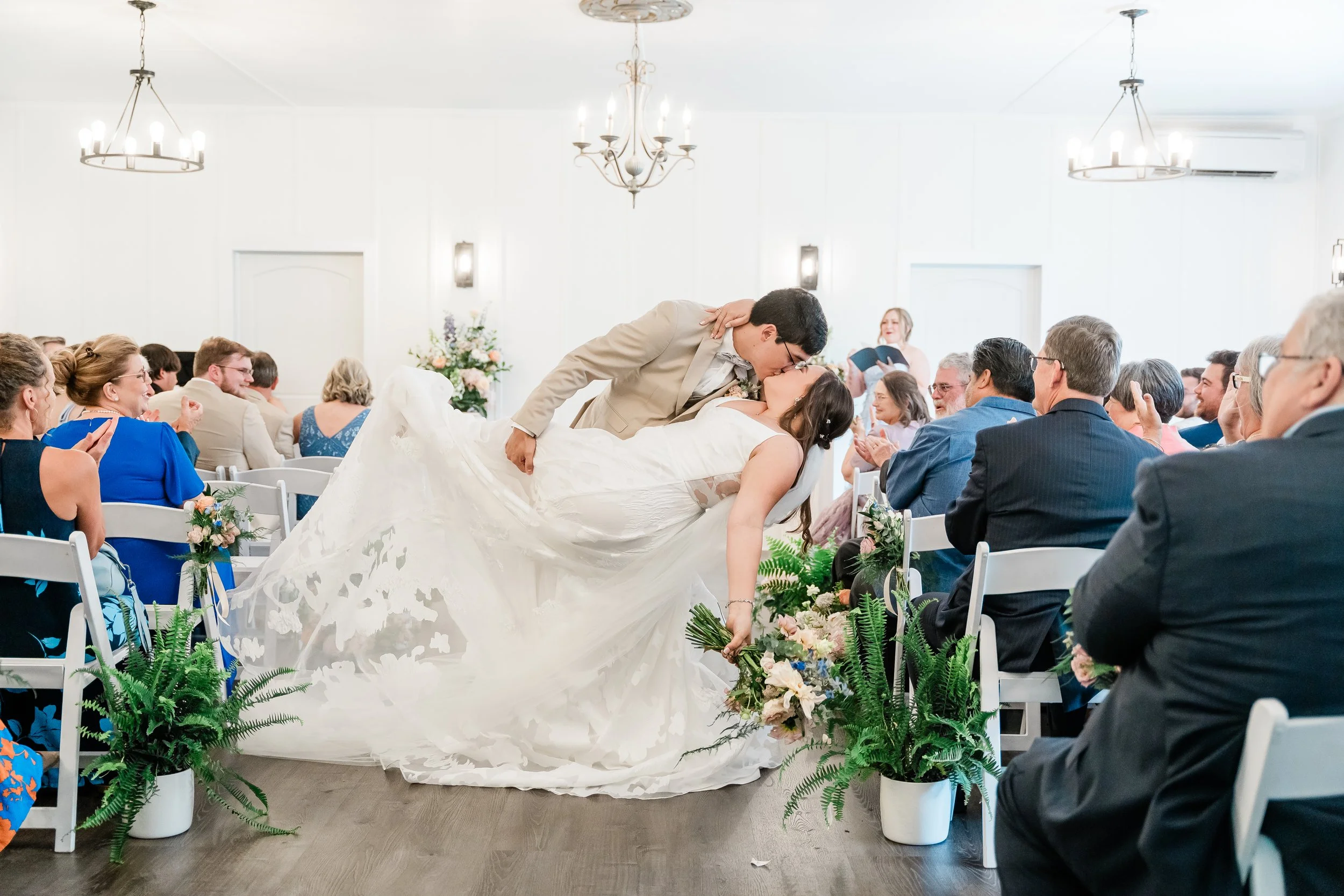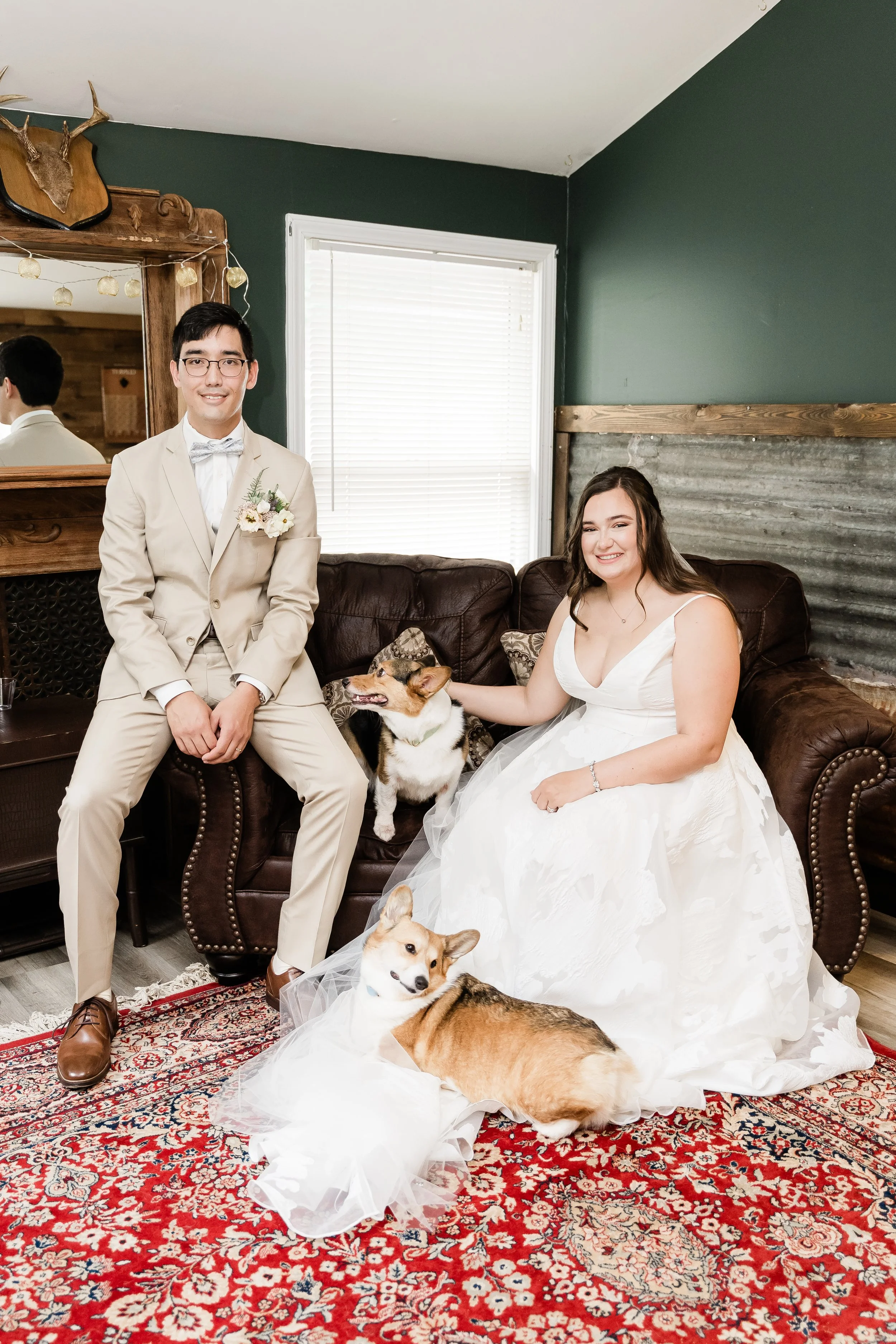 Halfway between Augusta and Atlanta on the national star wars holiday of may 4th, matt & kirsten’s wedding day was dreamy in so many ways. there were many classic touches and surprise little star wars winks hidden throughout. the wedding day itself was perfect and started off with everyone getting ready as we arrived to then do details. kirsten opened some of her gifts and continued to get into her beautiful dress as matt and his guys were in the whiskey room finishing up tying ties. once they were both ready, we set up around the ceremony area with matt to do a first look and private vows which also brings me to another point for this day. there happened to be a new brood of cicadas apparently and it was really loud which you can hear in the film at the beginning during their vows. From there, we did some formal photos and prepared for the ceremony which was inside due to the threat of rain that day. The ceremony was beautiful and had their corgis as a part of it as well as small little star wars trinkets hidden throughout the decor. Once they said their I do’s and kissed, they made their way out as husband and wife which dismissed to cocktail hour around the courtyard and patio. While that was happening, we went to the original ceremony location for family photos and some more formals afterwards. They then went to cocktail hour for a bit as the band made some final touches and we captured the reception space. Once it was time to announce them in, of course, they were announced by princess leia and storm troopers guarding the doors. They then went into their first dance and father daughter, mother son dances before being escorted back to their table by the storm troopers for dinner. from then on, it was basically a huge party where the band led with a bunch of fun songs. eventually, deep into the party of the night, we did a fake sparkler send off once the rain stopped and before too many people left. it was super funny and they laughed even through an accidental drop during a dip kiss and the sparkler line was ended by lightsabers as well which followed them running back inside and dancing the night away. it was such a joyful day and we loved being a part of every minute!