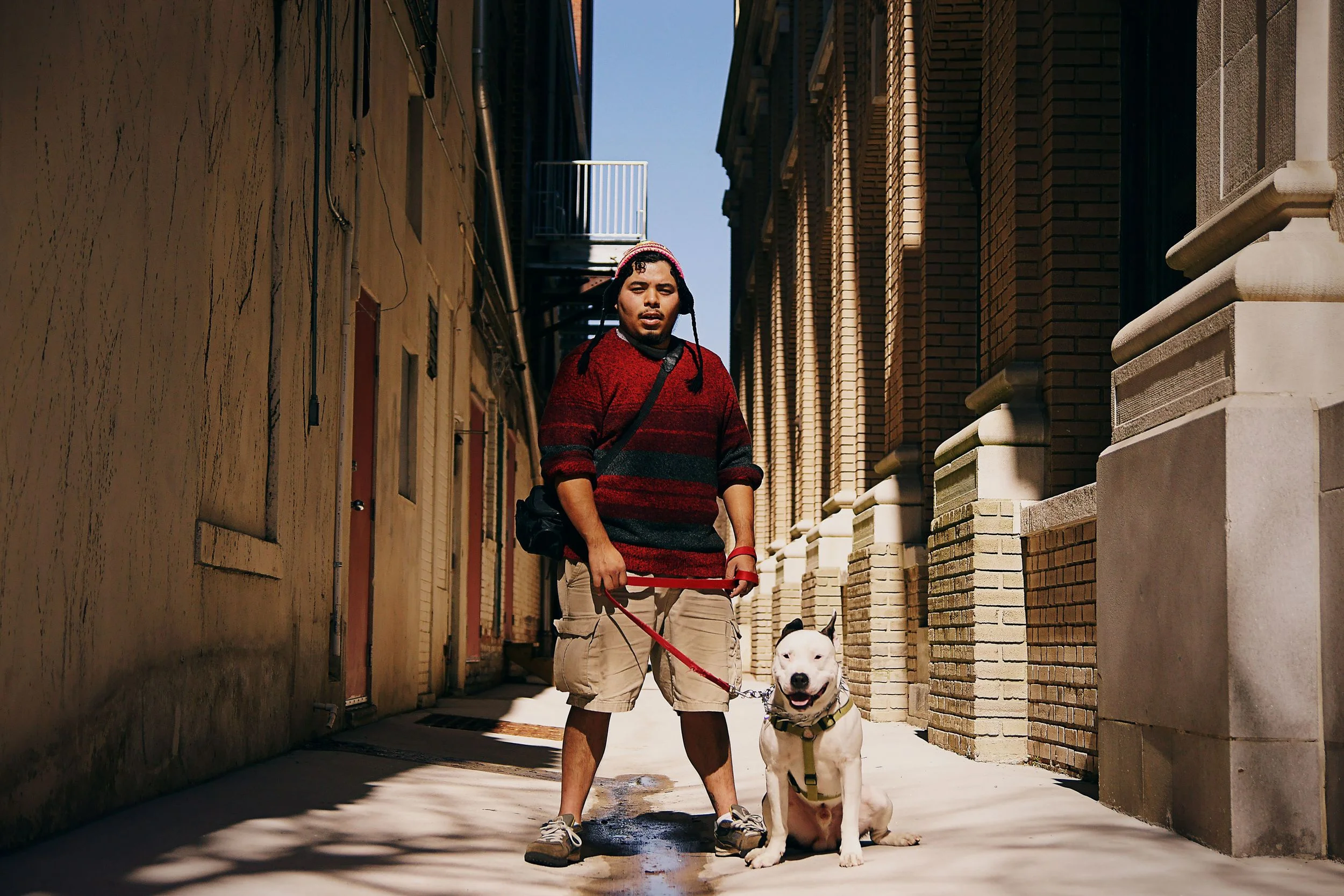 A man wearing a red and black sweater, beige shorts, and sneakers standing on a sidewalk with a white dog on a leash in an alley between brick buildings on a sunny day.